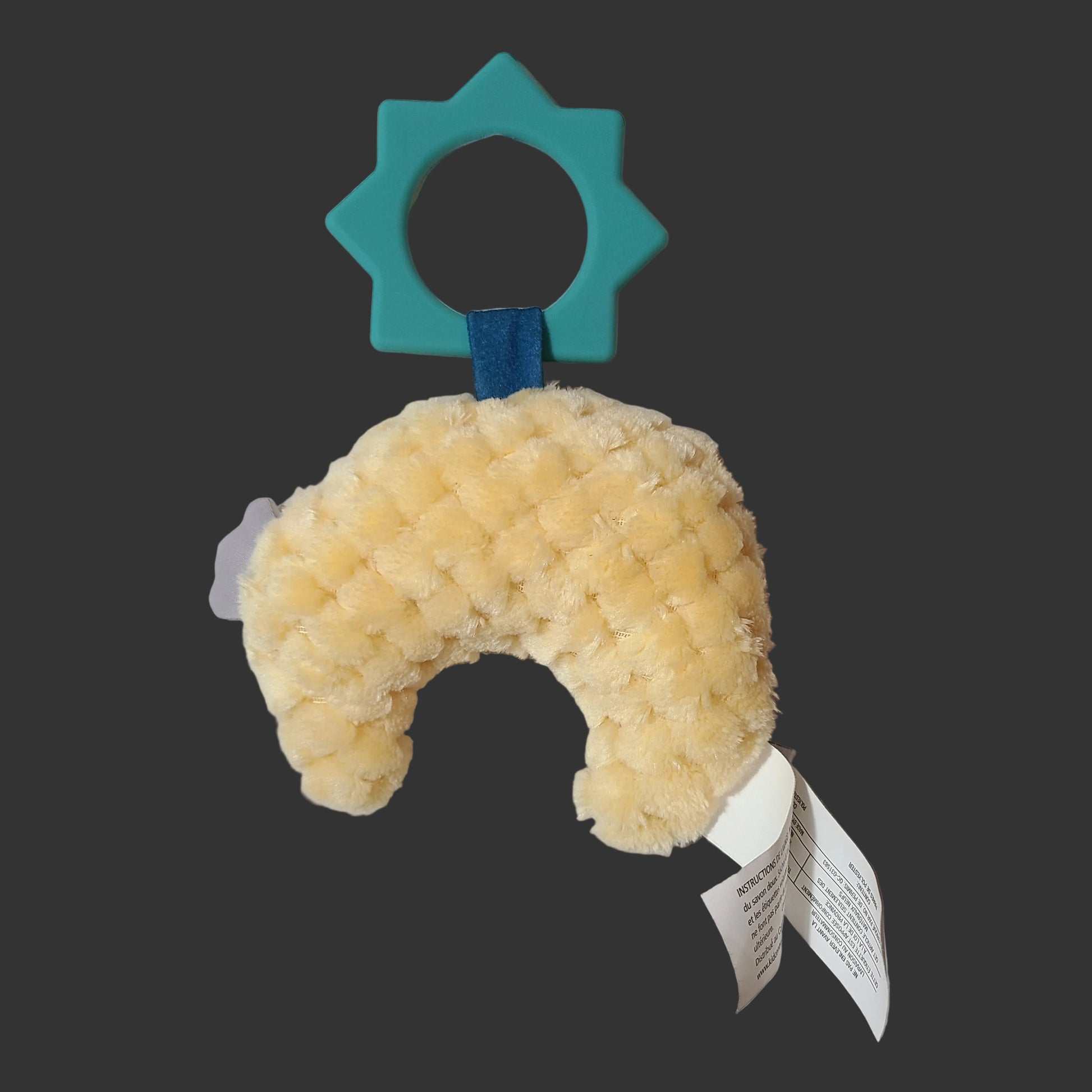 Mary Meyer's Cosmo Crescent Moon Teether Rattle combines soft plush comfort with gentle teething relief, perfect for soothing sore gums during those early months. This like-new piece features a crescent moon design with sensory textures that engage curious hands and minds. The integrated rattle adds auditory stimulation while the lightweight construction makes it easy for little ones to grasp and explore. Ideal for newborns and infants seeking comfort and developmental play in one charming, durable toy.