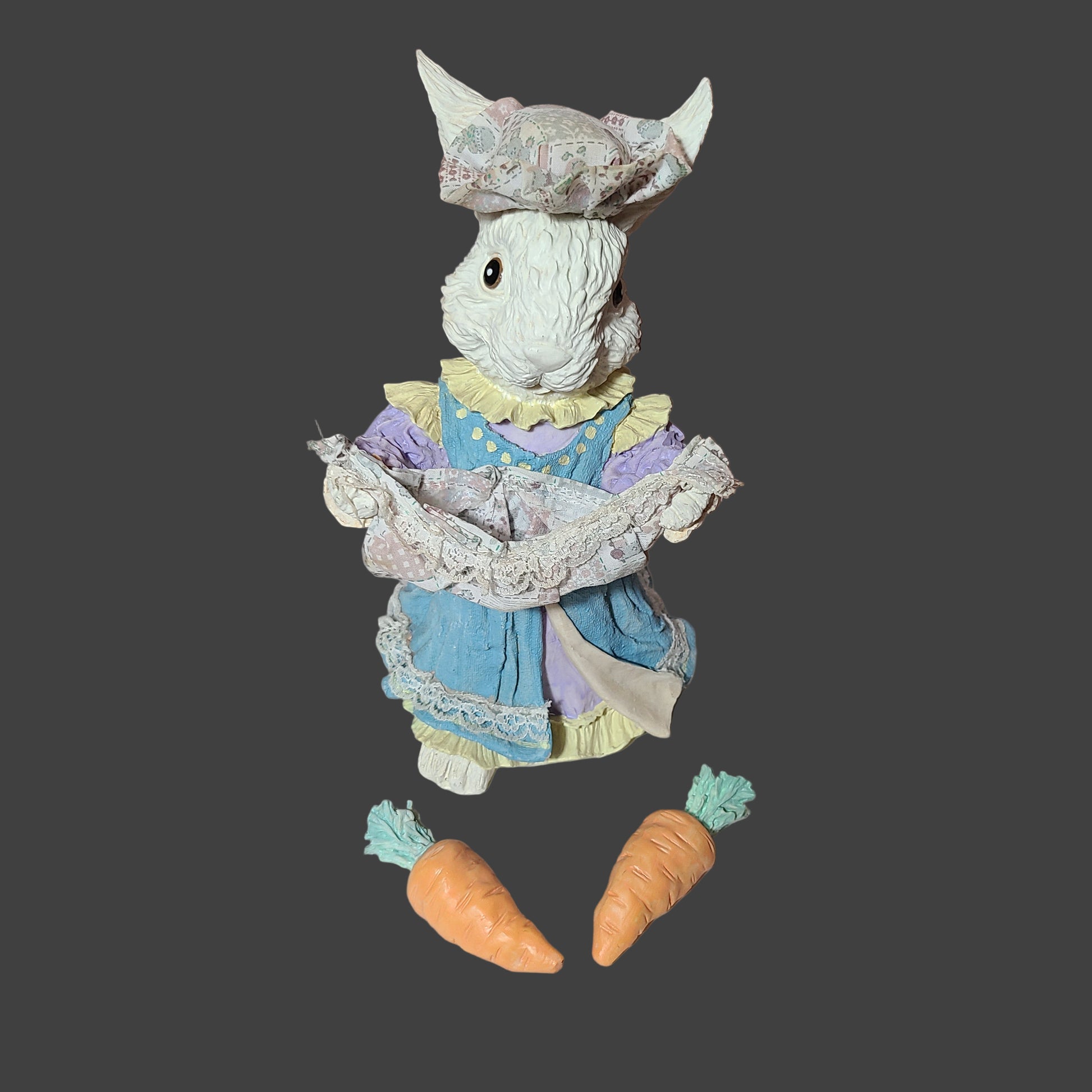 VTG Easter Bunny Resin Figurine w/ Soft Hat & Basket w/ Removeable Resin Carrots - USED