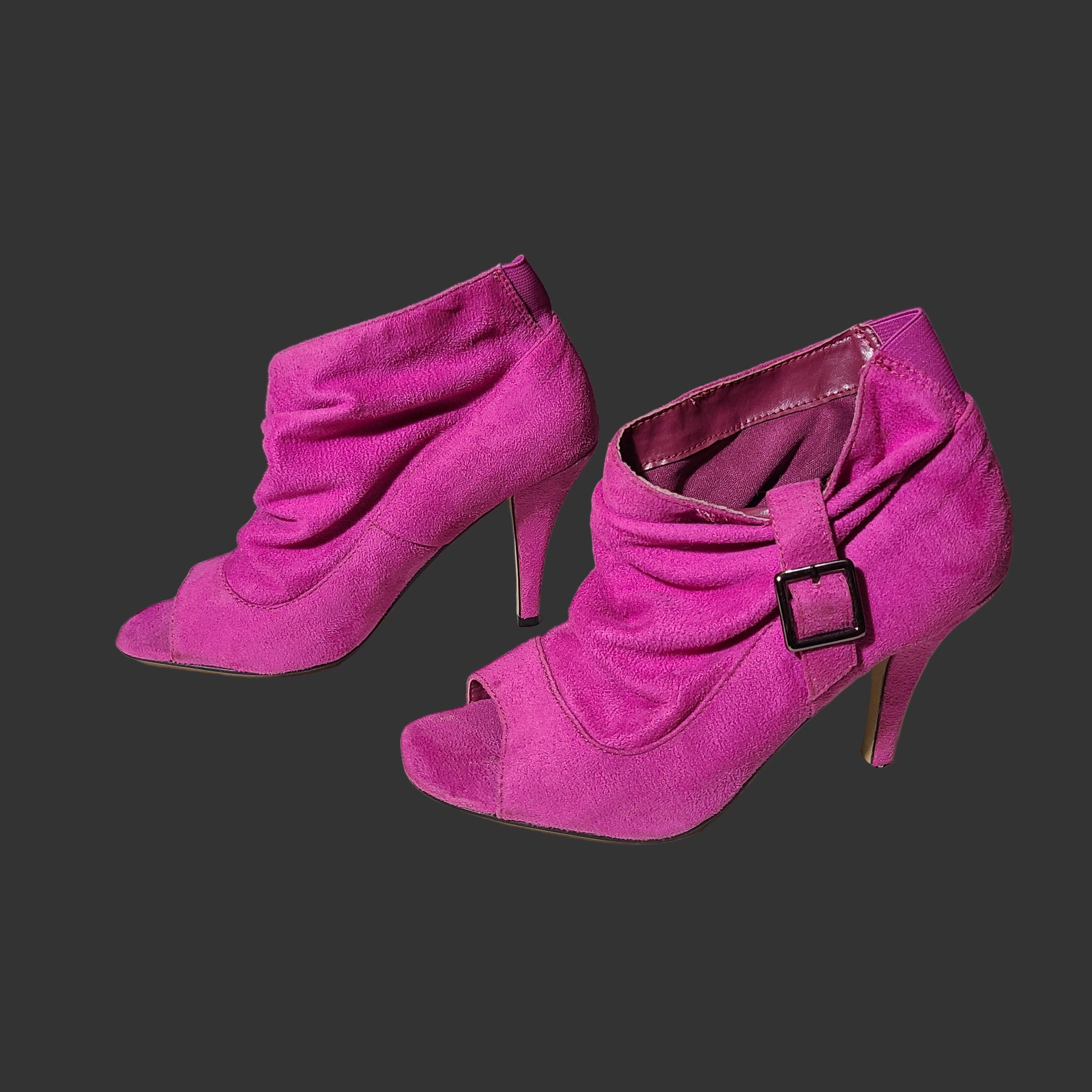 Elevate your style with these vibrant Pierre Dumas hot pink ankle heels in size 8M. Designed to add a bold pop of color to any outfit, these heels offer a sleek silhouette perfect for special occasions or nights out. Please note, one heel tip is missing, sold as-is, making them an ideal choice for those who enjoy customizing or appreciate a unique find at a great value. Grab these standout heels and step confidently in eye-catching color and charm.
